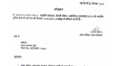 आईपीएस अधिकारी रचिता जुयाल का इस्तीफा स्वीकार, 16 सितंबर से सेवा मुक्त नई दिल्ली। केंद्र सरकार ने उत्तराखंड कैडर की…