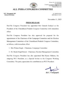 कांग्रेस के इस निर्णय को आगामी विधानसभा चुनावों की रणनीति से जोड़कर देखा जा रहा है। गणेश गोदियाल पहले भी प्रदेश अध्यक्ष रह चुके हैं और पार्टी संगठन को जमीनी स्तर पर मजबूत करने के लिए जाने जाते हैं।