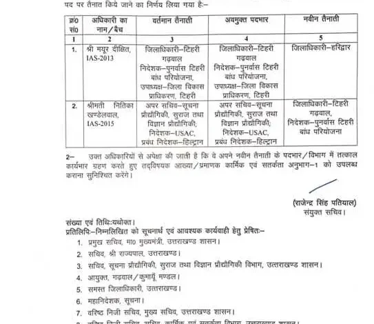 तत्काल प्रभाव से भारतीय प्रशासनिक सेवा के निम्नलिखित अधिकारियों को उनके नाम के सम्मुख अंकित विभाग/पदभार में से स्तम्भ 4 में उल्लिखित पदभार से अवमुक्त करते हुए स्तम्भ-5 में उल्लिखित पद पर तैनात किये जाने का निर्णय लिया गया है:-