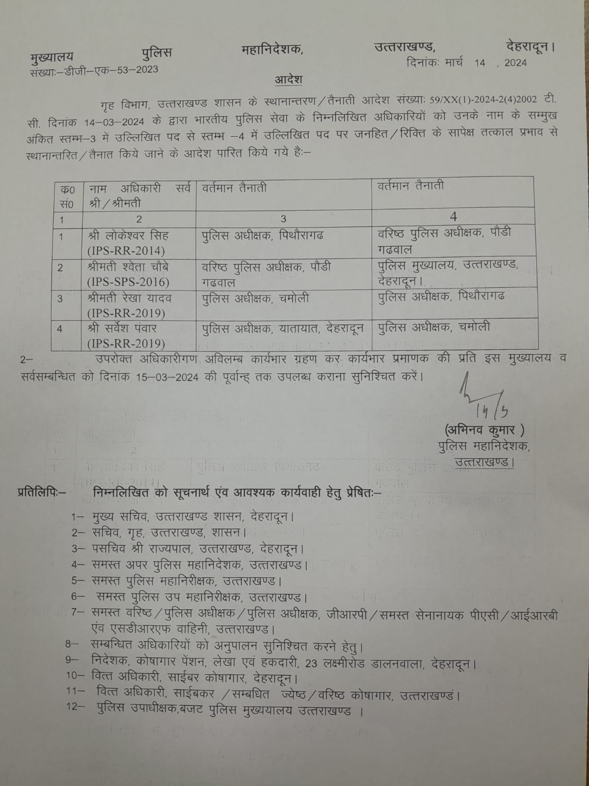 देहरादून। लोकसभा चुनाव की आचार संहिता लगने से पहले उत्तराखंड शासन ने 4 IPS अफसरों का ट्रांसफर किया गया है। आईपीएस अधिकारी लोकेश्वर सिंह पौड़ी जिले के नए कप्तान होंगे। जबकि श्वेता चौबे को पुलिस मुख्यालय देहरादून भेजा गया है। देहरादून में एसपी ट्रैफिक की जिम्मेदारी संभाल रहे आईपीएस सर्वेश पंवार को एसपी चमोली बनाकर भेजा गया है जबकि एसपी चमोली रेखा यादव अब एसएसपी पिथौरागढ़ बनाई गई हैं।