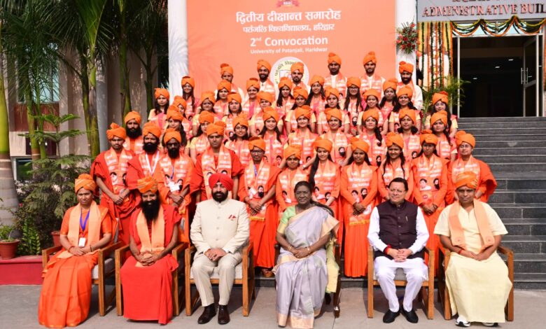 राष्ट्रपति द्रौपदी मुर्मु ने पतंजलि विश्वविद्यालय हरिद्वार के द्वितीय दीक्षांत समारोह में स्वर्ण पदक प्राप्त विद्यार्थियों को सम्मानित किया। रविवार को आयोजित इस कार्यक्रम में कुल 1454 विद्यार्थियों को उपाधि प्रदान की गई। 62 शोधार्थियों को विद्या वारिधि और 3 शोधार्थियों को विद्या वाचस्पति की उपाधि प्रदान की गई, जबकि 615 विद्यार्थियों को परास्नातक और 774 विद्यार्थियों को स्नातक की उपाधि प्रदान की गई। इस अवसर पर राज्यपाल लेफ्टिनेंट जनरल गुरमीत सिंह (से नि.) ने राष्ट्रपति को राष्ट्रपति भवन की विविध वनस्पतियों पर आधारित दो पुस्तकें ‘फ्लोरा ऑफ राष्ट्रपति भवन’ एवं ‘मेडिसिनल प्लांट्स ऑफ राष्ट्रपति भवन’ की प्रतिलिपियाँ भी भेंट कीं।